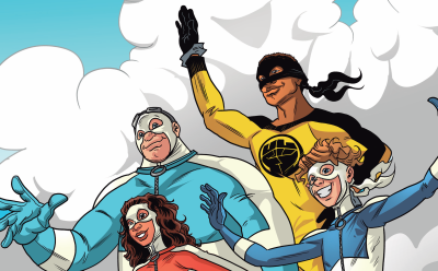 Superhelten The Urban Legend med side kicks Sophia, Mike og Chris