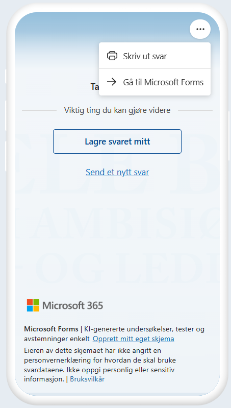 Dersom du ønsker en bekreftelse på at du har svart på evalueringen kan du derfor ta en skjermdump etter avsluttet skjema. Eller du kan velge å skrive skjema ut. Det gjøres etter avsluttet undersøkelse ved å klikke på det tre prikkene oppe i høyre hjørne. Velg så skriv ut svar. Har du ikke skriver kan du velge alternativ lagre pdf ved valg av skriver i skriverunnstillingen etter at du trykker på skriv ut.