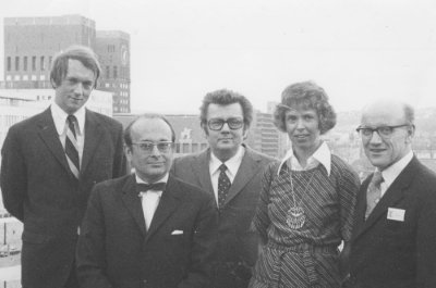 Bildetekst: Det er en lang tradisjon at Psoriasis- og eksemforbundet deler ut forskningsstipend på sitt landsmøte. På landsmøtet i 1976 ble det delt ut forskningsstipendier til doktor Arne Halsos (f.v.), professor Rajka og doktor Ulla Britt Neethe. Her står de sammen med forbundets daværende nestformann Finn Stian Pedersen og formann Knut Fongen.