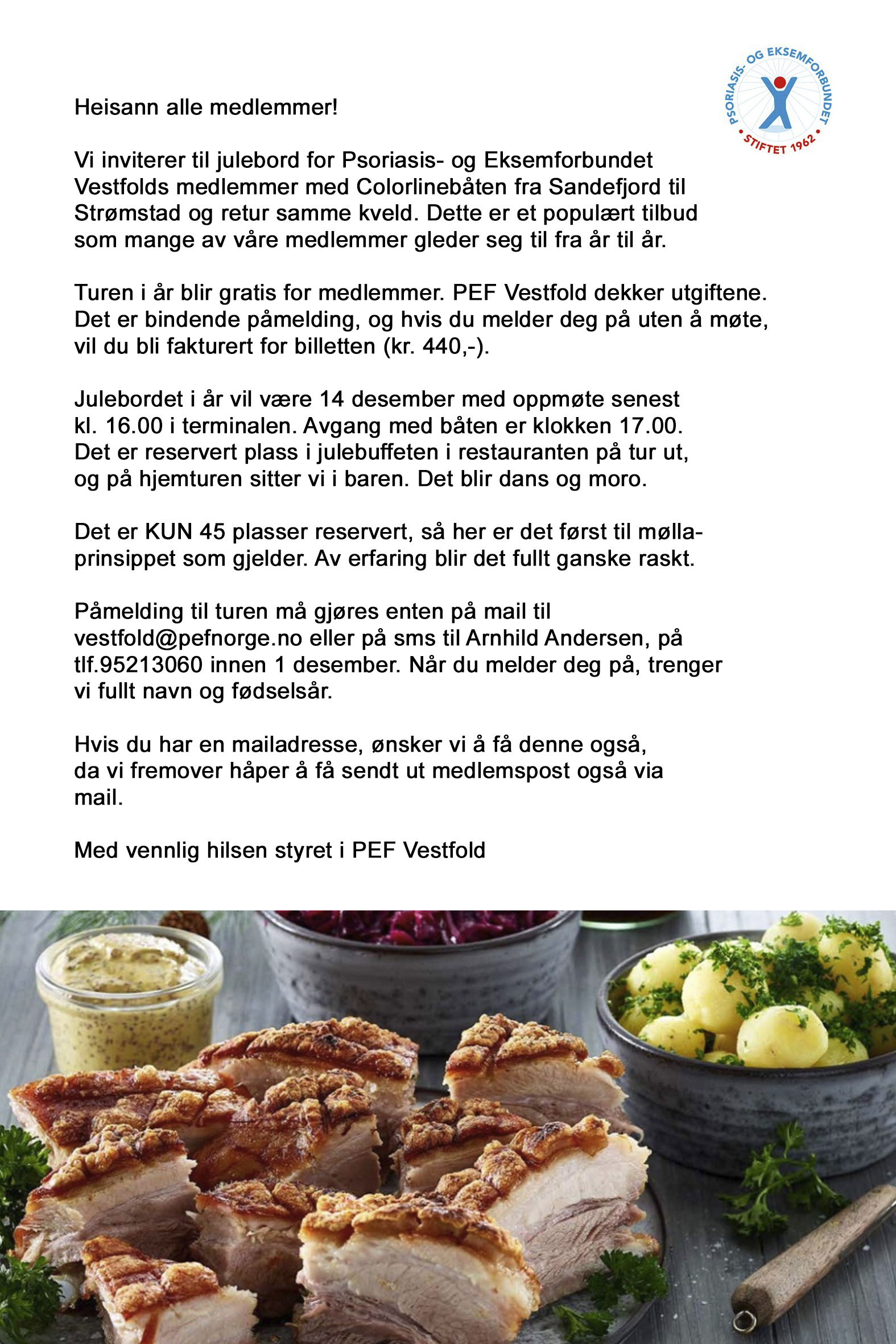 14.desember inviteres alle medlemmer til julebord. Arrangementet er gratis, og vi praktiserer førstemann- til- mølla. Ikke nøl, meld deg på i dag! Les mer om arrangementet i vedlagt invitasjon.